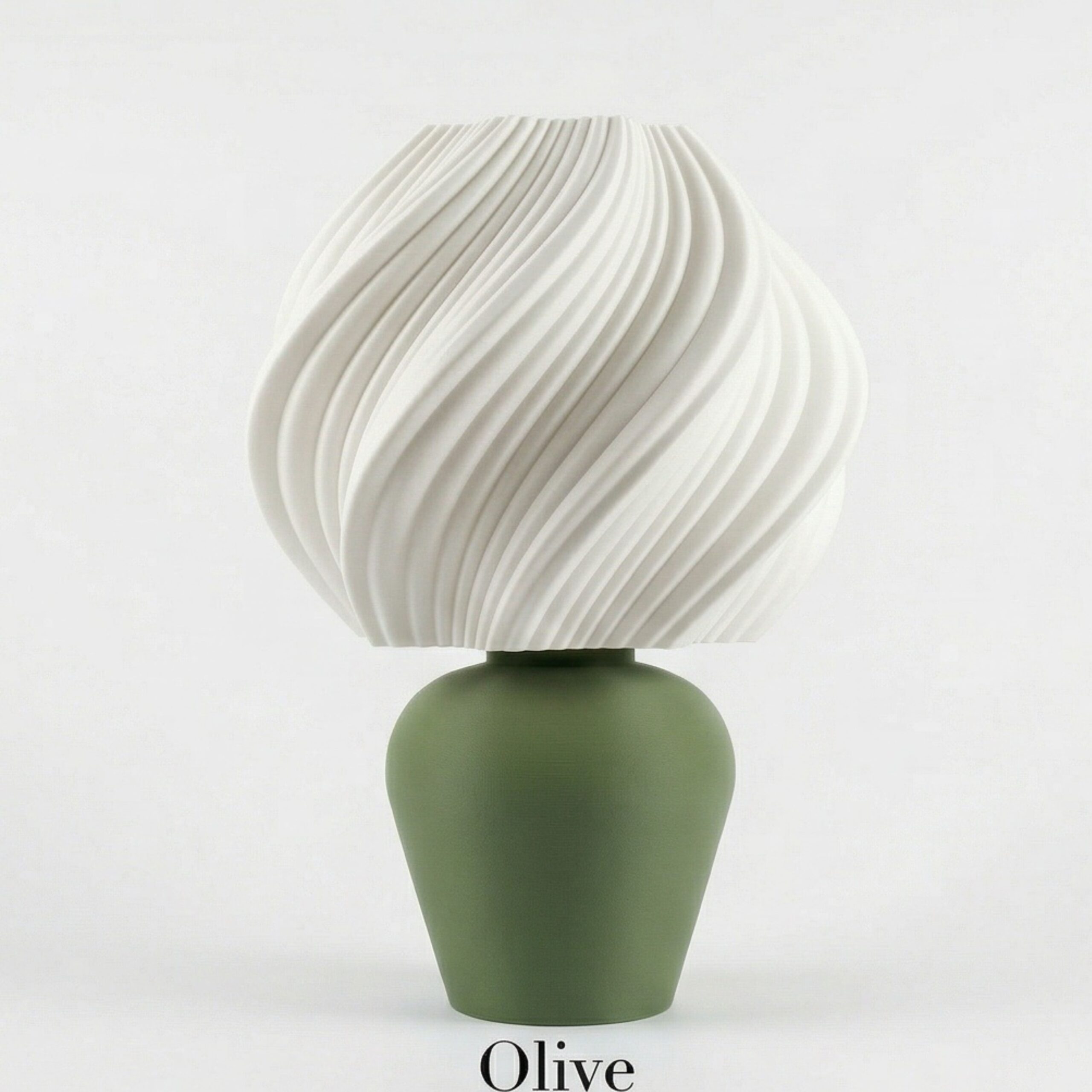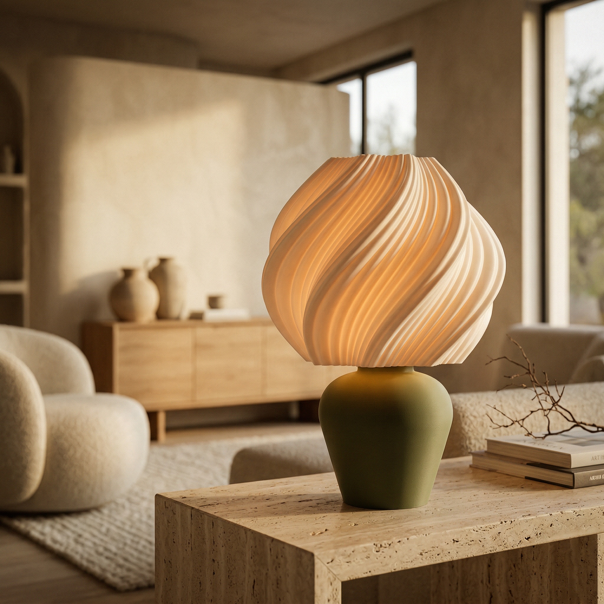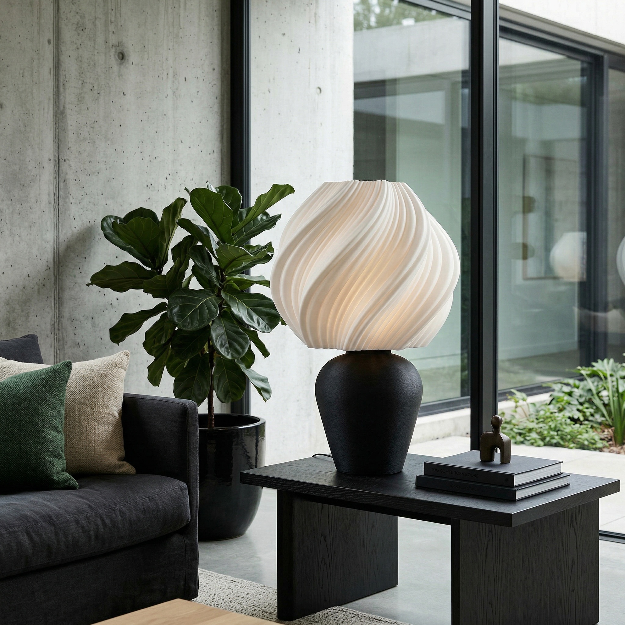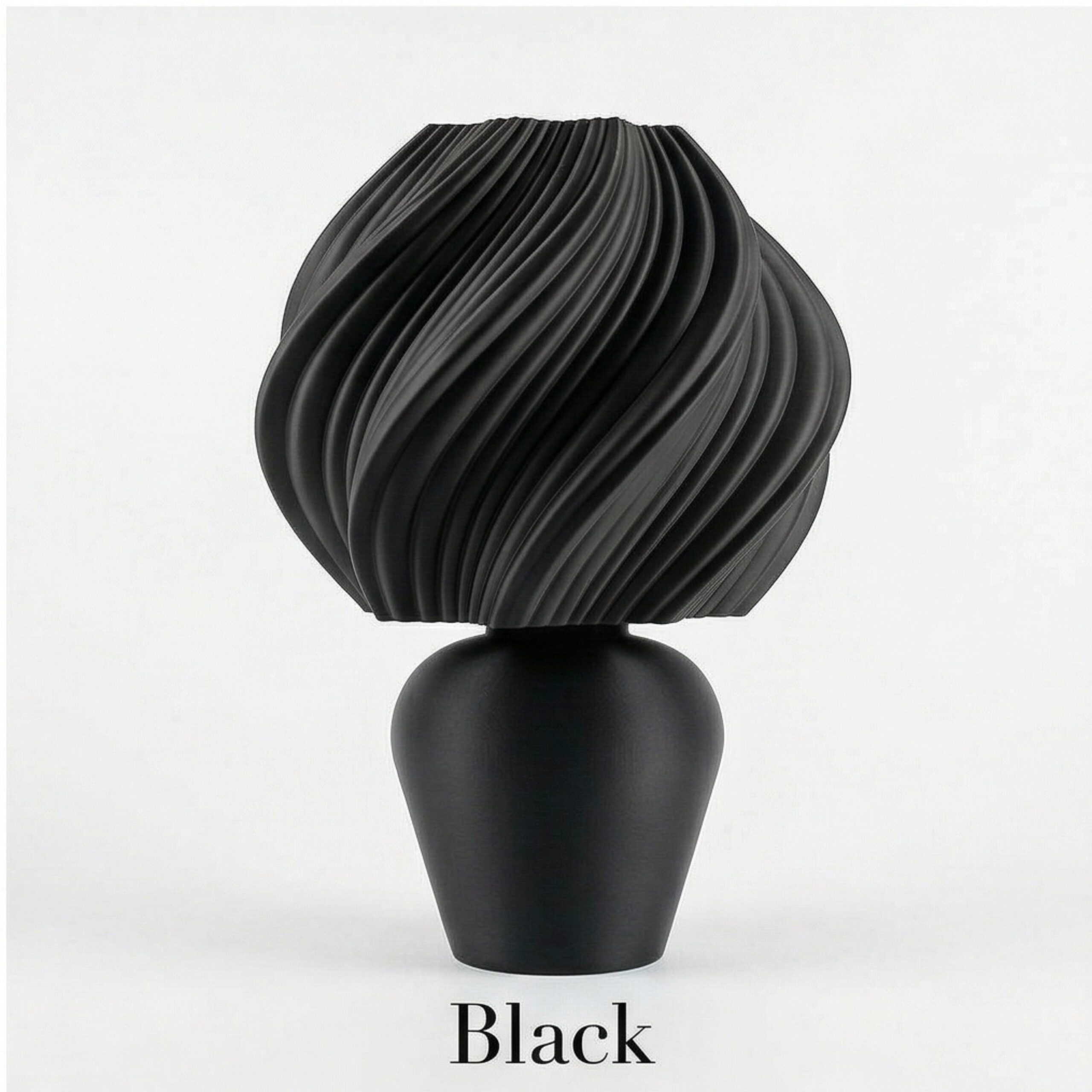 Inspired by modern European design and Japandi minimalism, the softly curved shade diffuses light into a gentle, enveloping warmth. The subtle fluted texture enhances depth and shadow play, while the solid base grounds the piece with balance and calm presence.