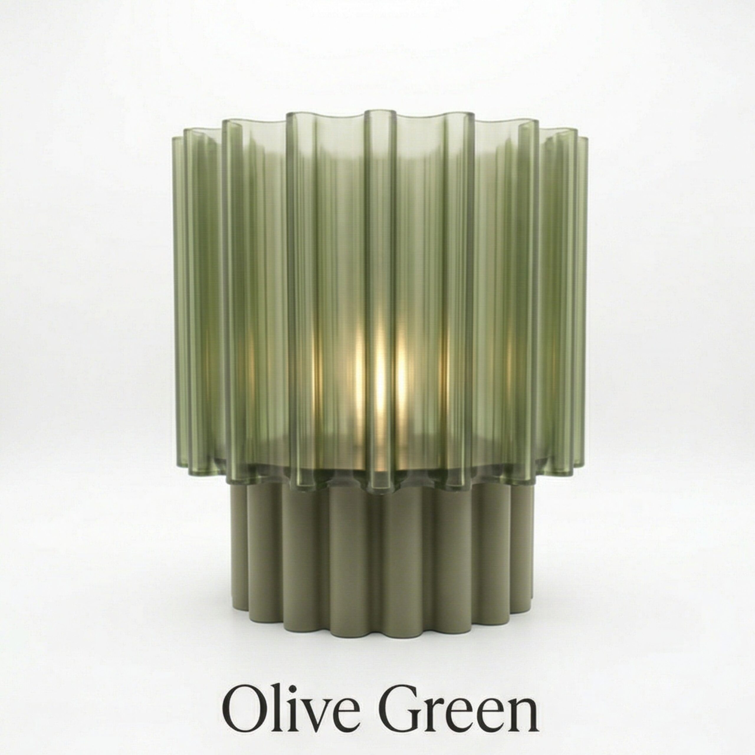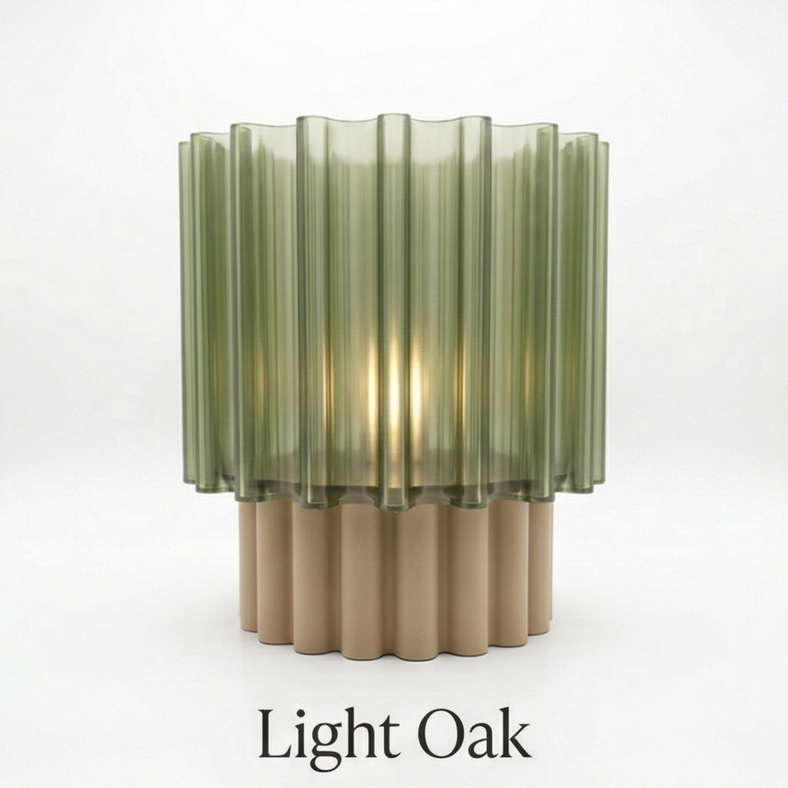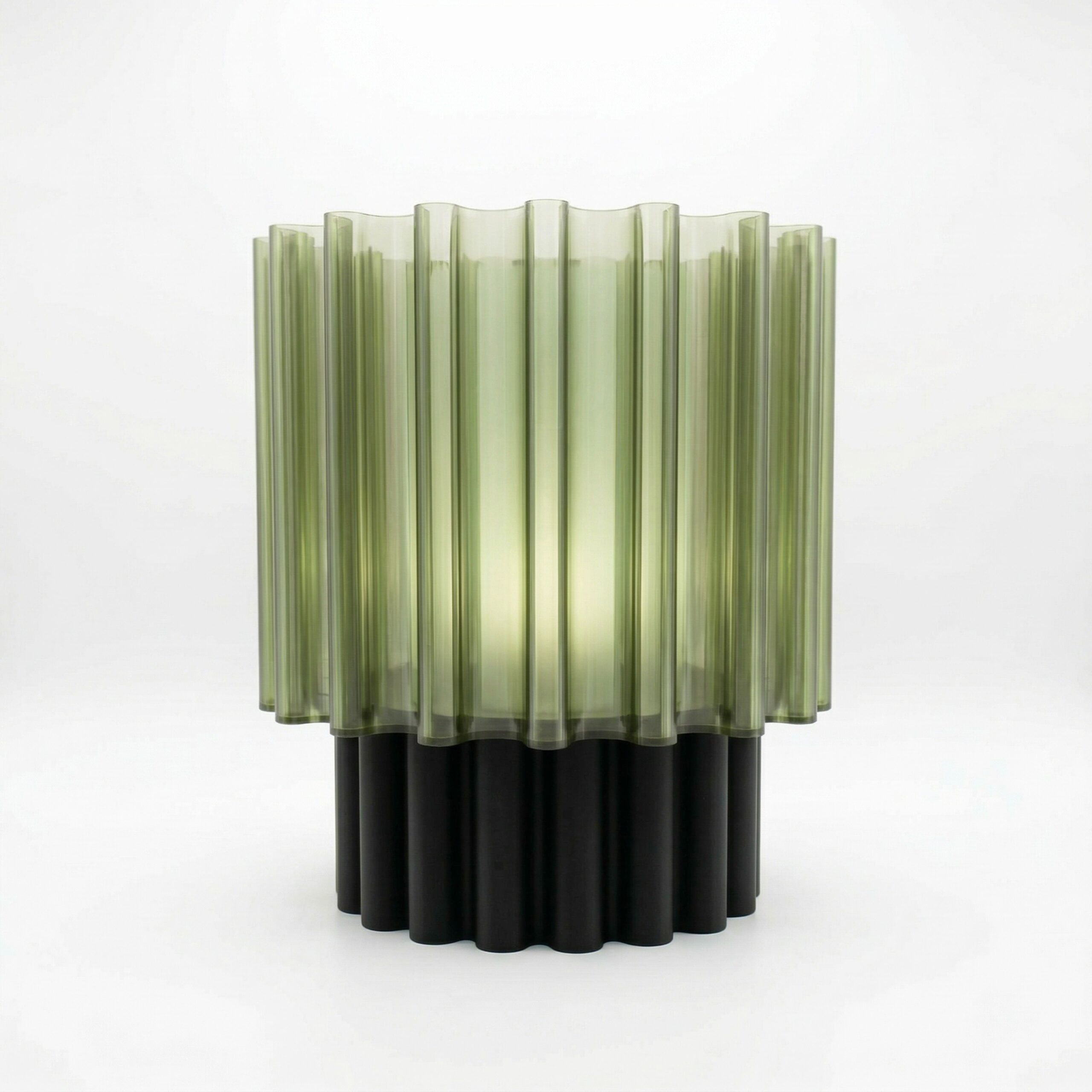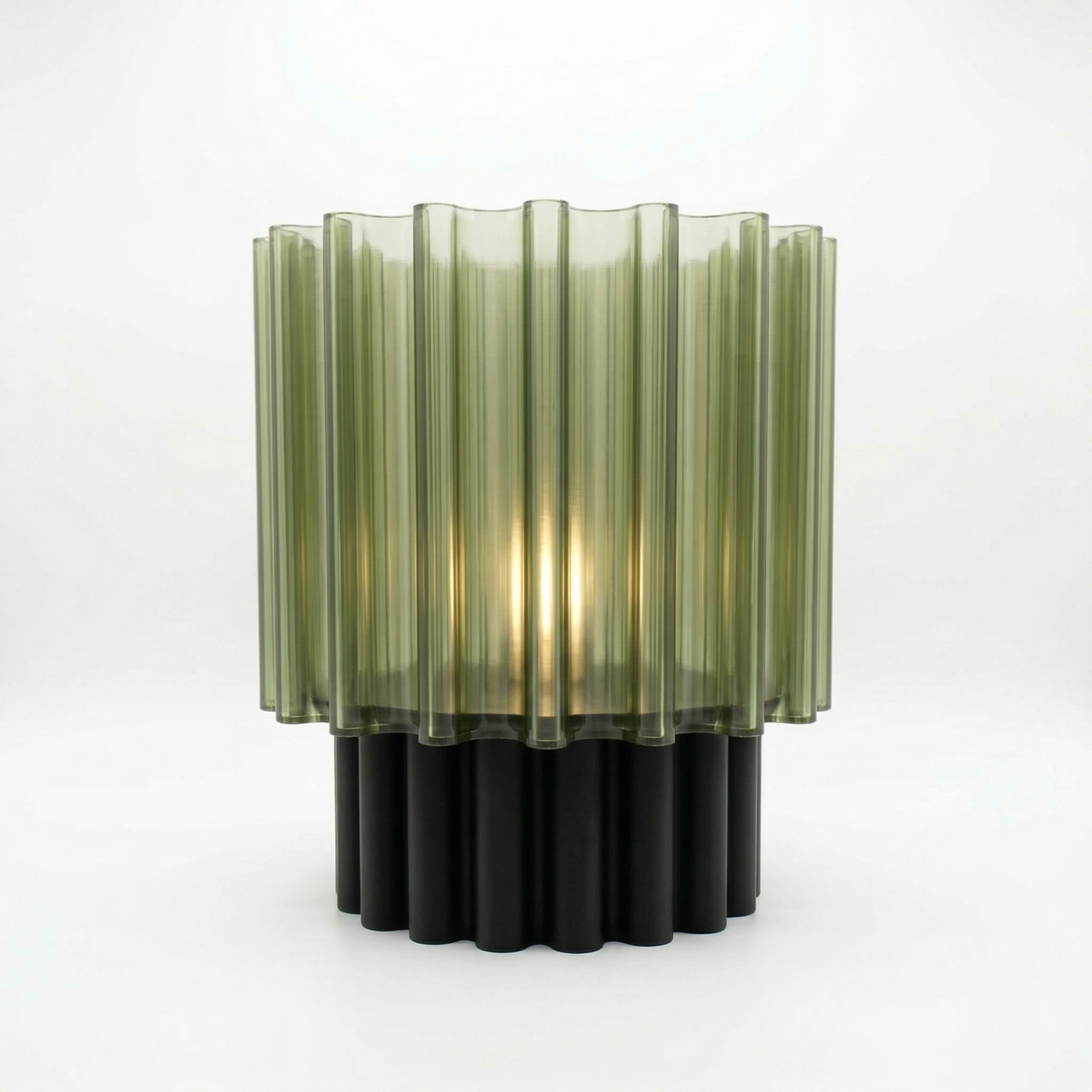 Its refined, rhythmic silhouette combined with a semi-transparent green shade creates a captivating play of light and shadow. When illuminated, the warm glow softly diffuses through the structure, producing a calming, ambient effect that feels both intimate and sophisticated.