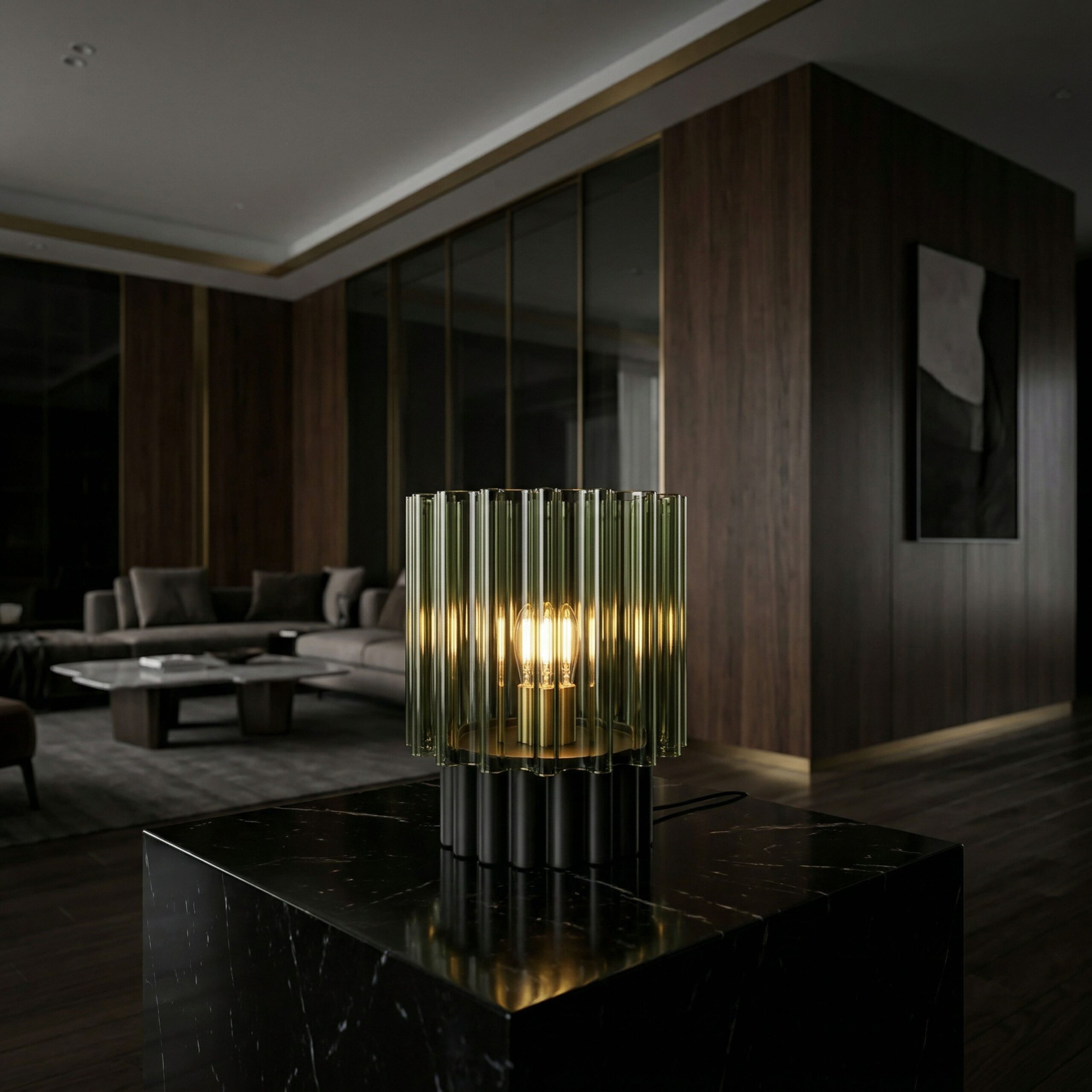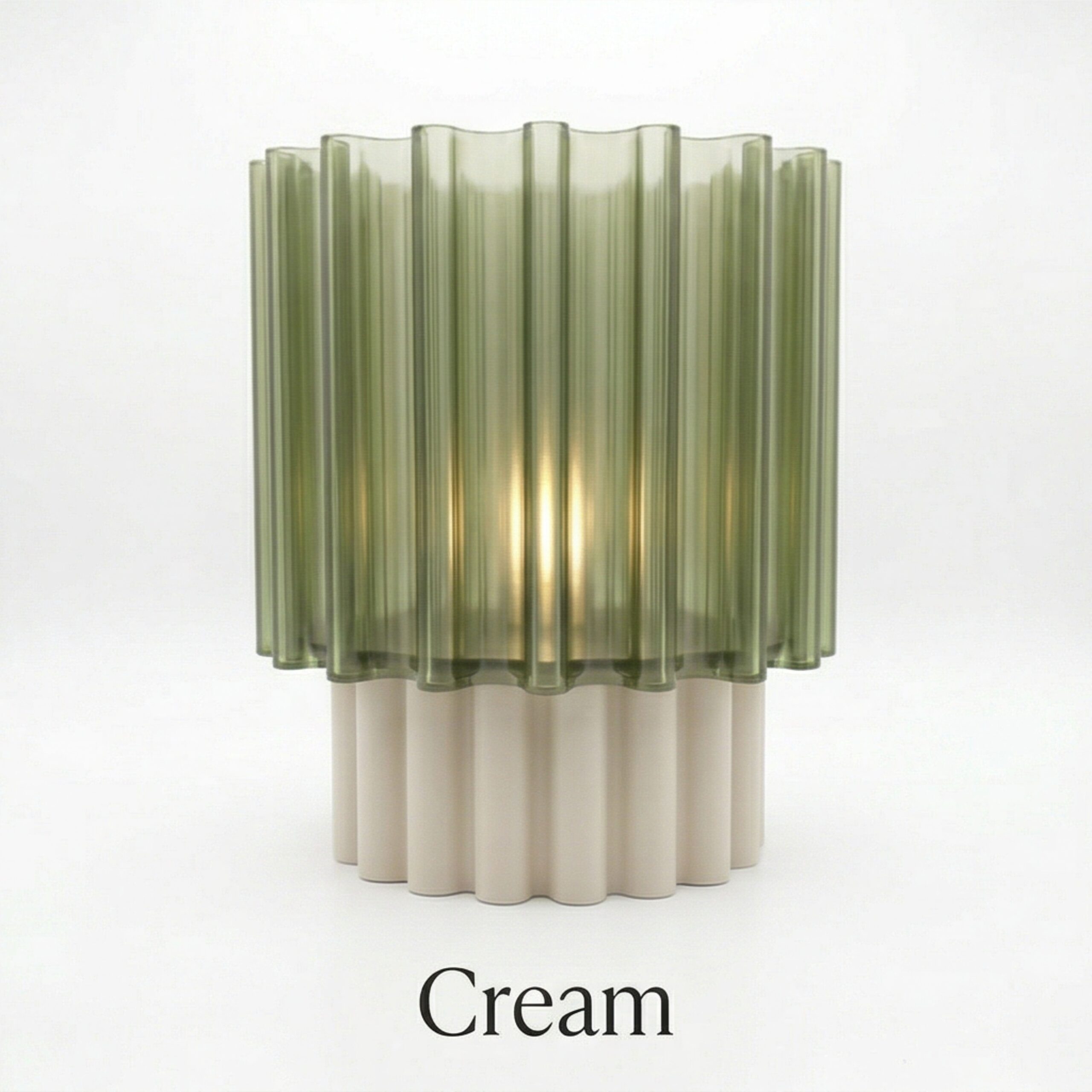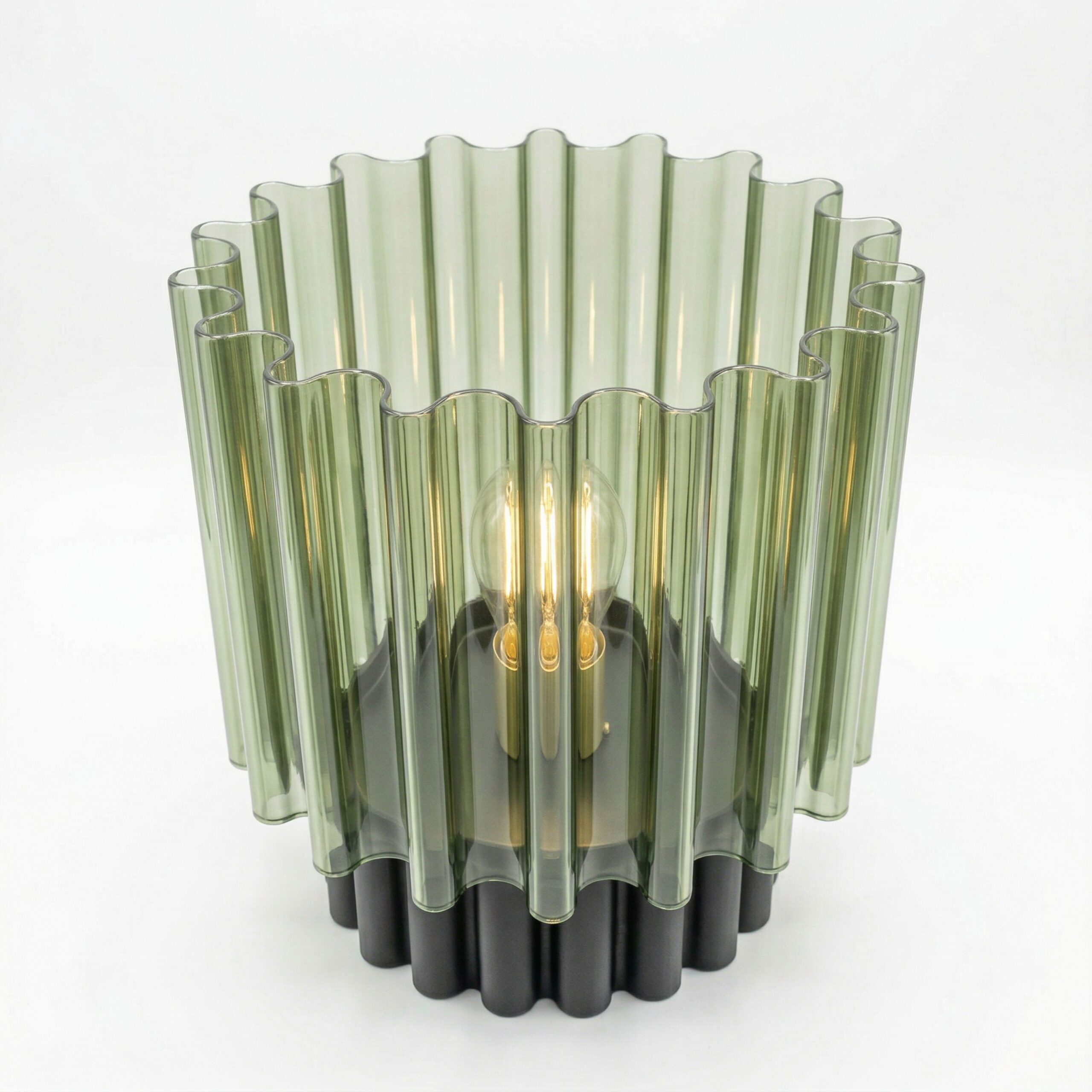 Its refined, rhythmic silhouette combined with a semi-transparent green shade creates a captivating play of light and shadow. When illuminated, the warm glow softly diffuses through the structure, producing a calming, ambient effect that feels both intimate and sophisticated.