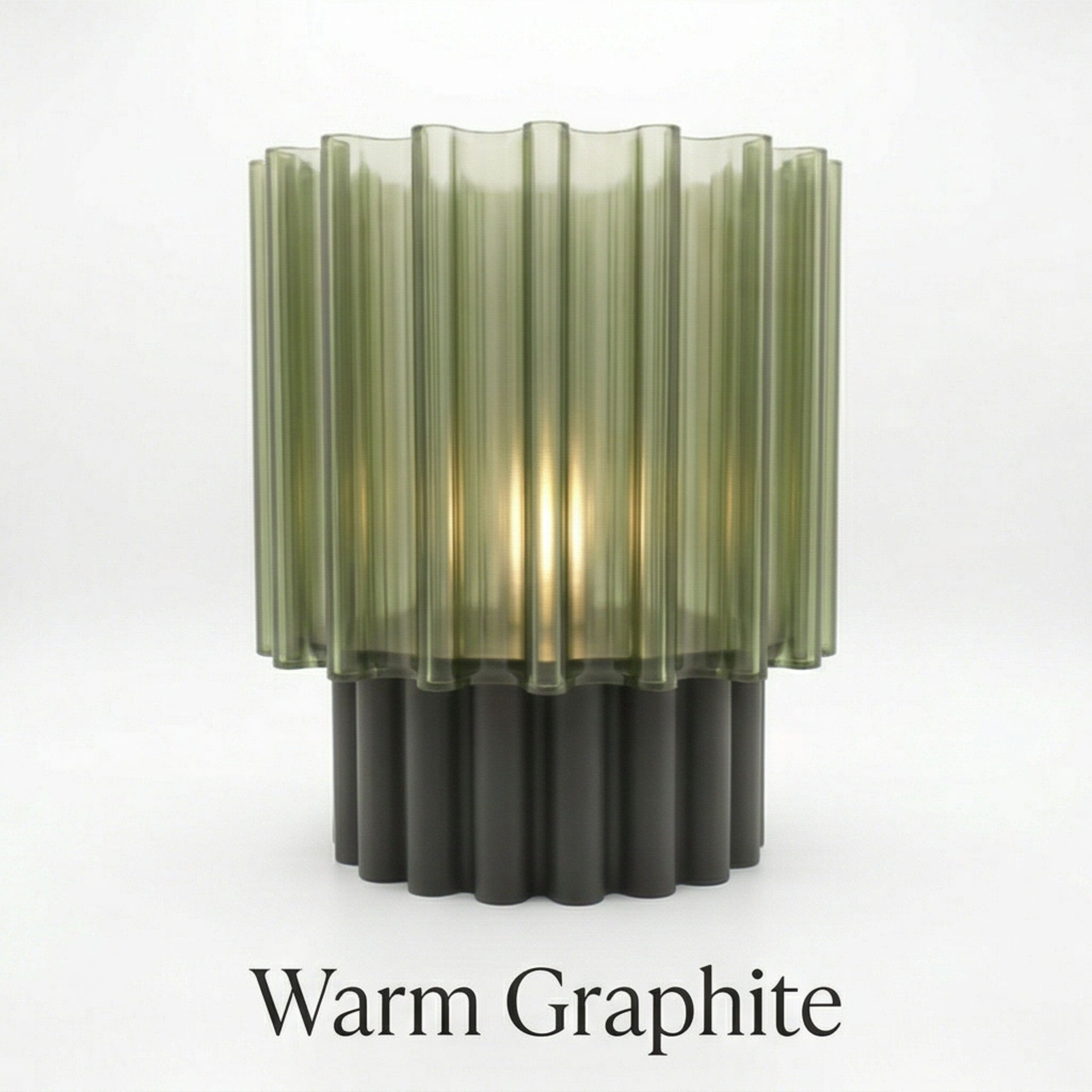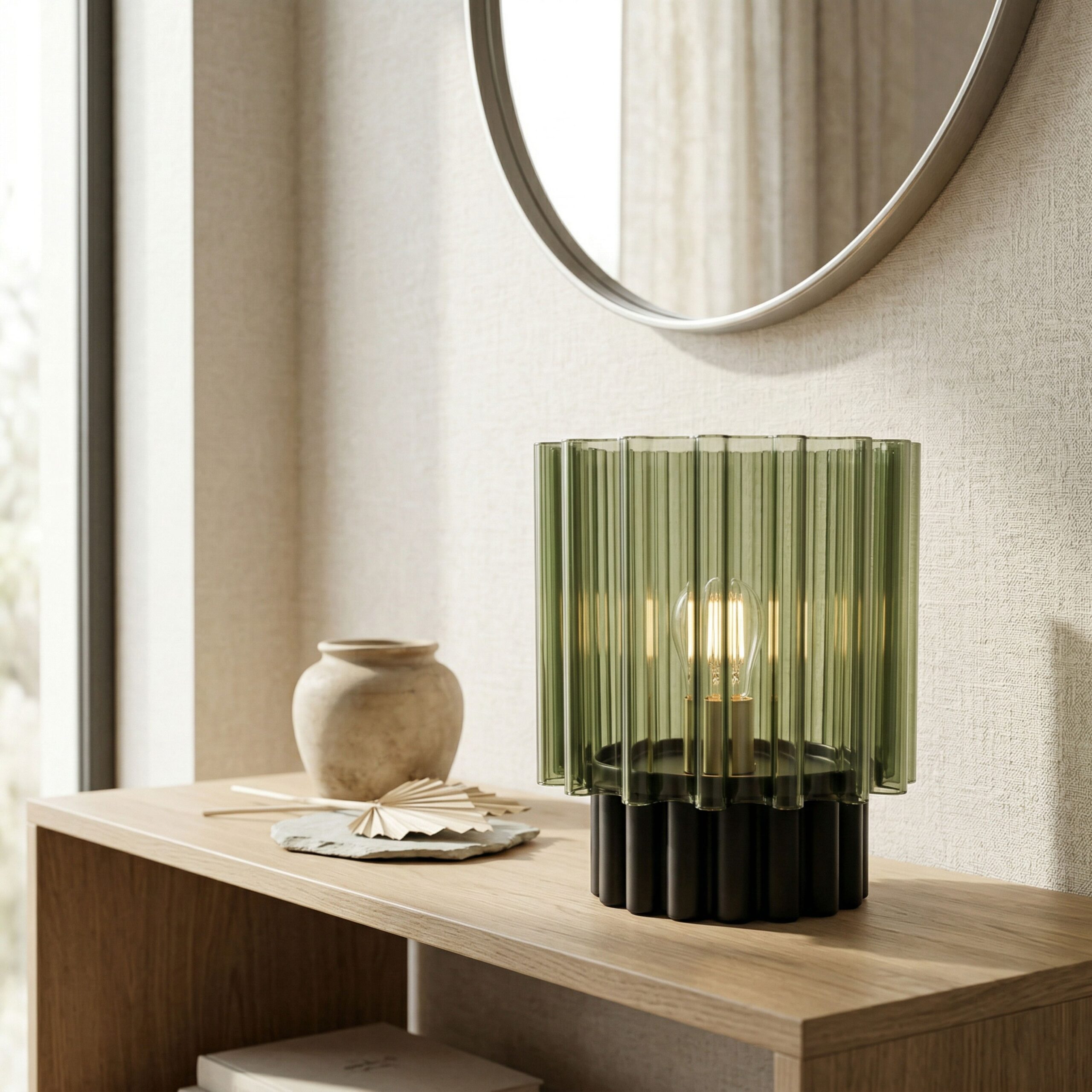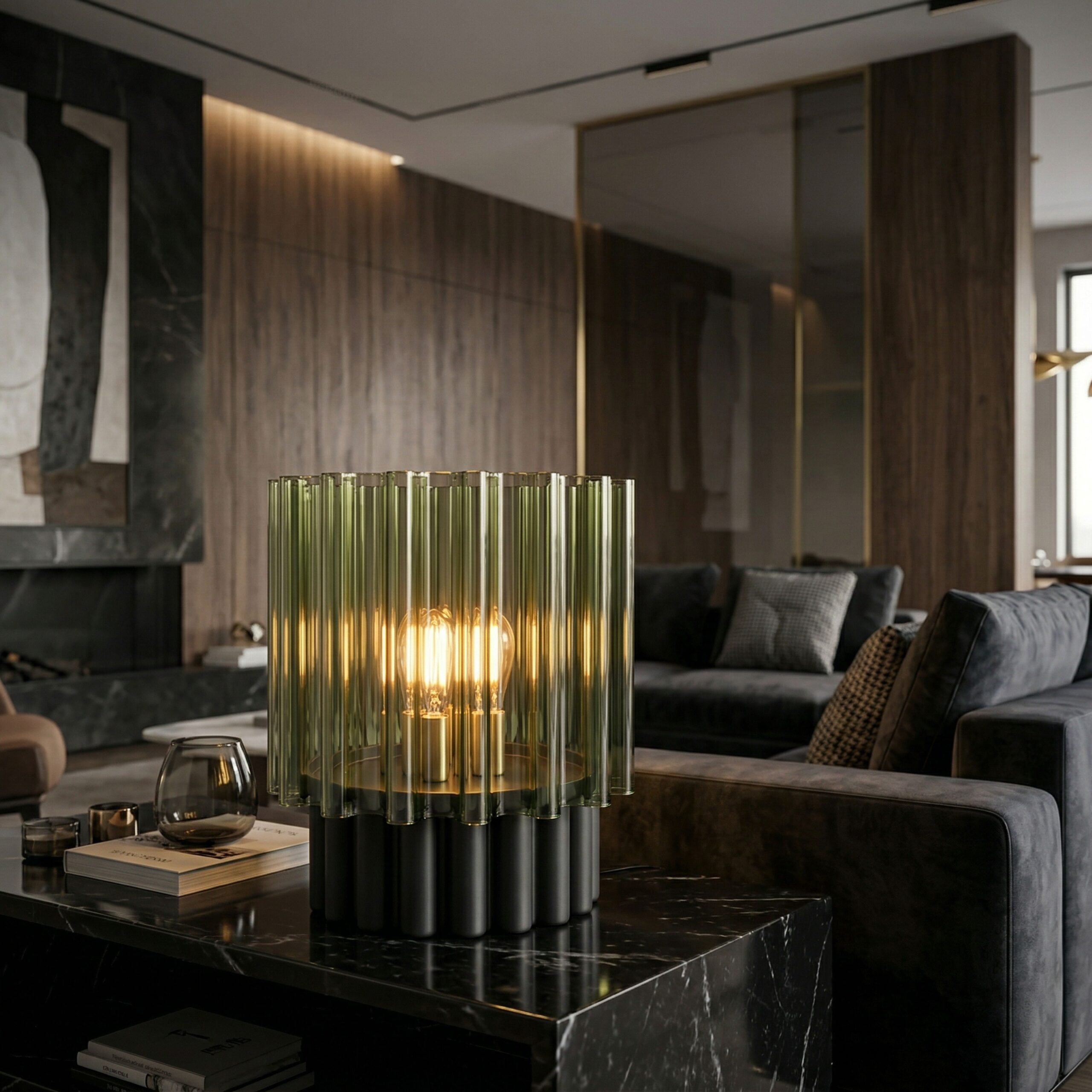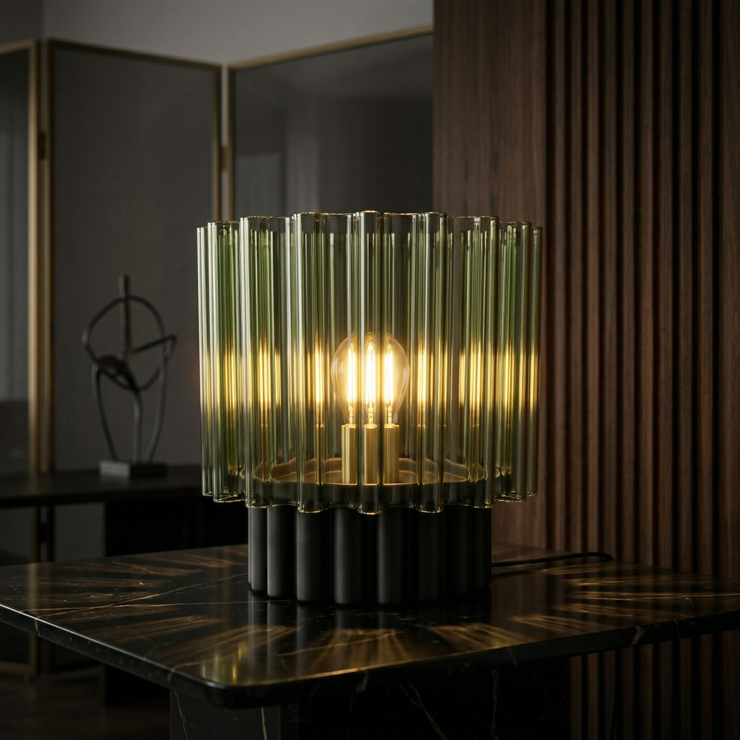 Its refined, rhythmic silhouette combined with a semi-transparent green shade creates a captivating play of light and shadow. When illuminated, the warm glow softly diffuses through the structure, producing a calming, ambient effect that feels both intimate and sophisticated.